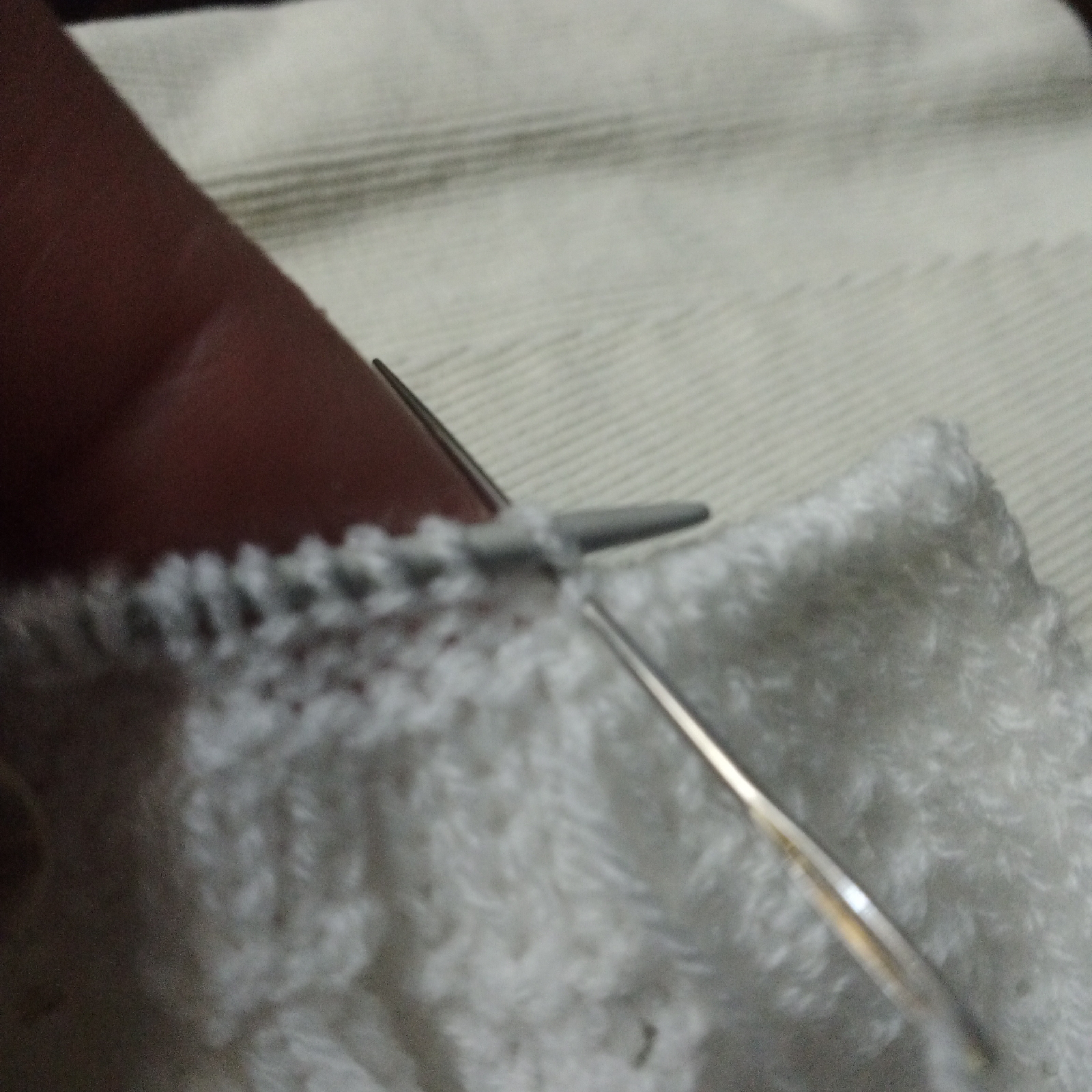 Ahora toca hacer un punto derecho y coger la lana blanca de la primera vuelta entre el primer y segundo punto y subirlo a las agujas para hacerlo al derecho. La lana gris te ayuda a visualizar bien la vaga de la primera vuelta. Continúa alternando un punto revés de la tercera vuelta con un punto derecho de la primera vuelta....